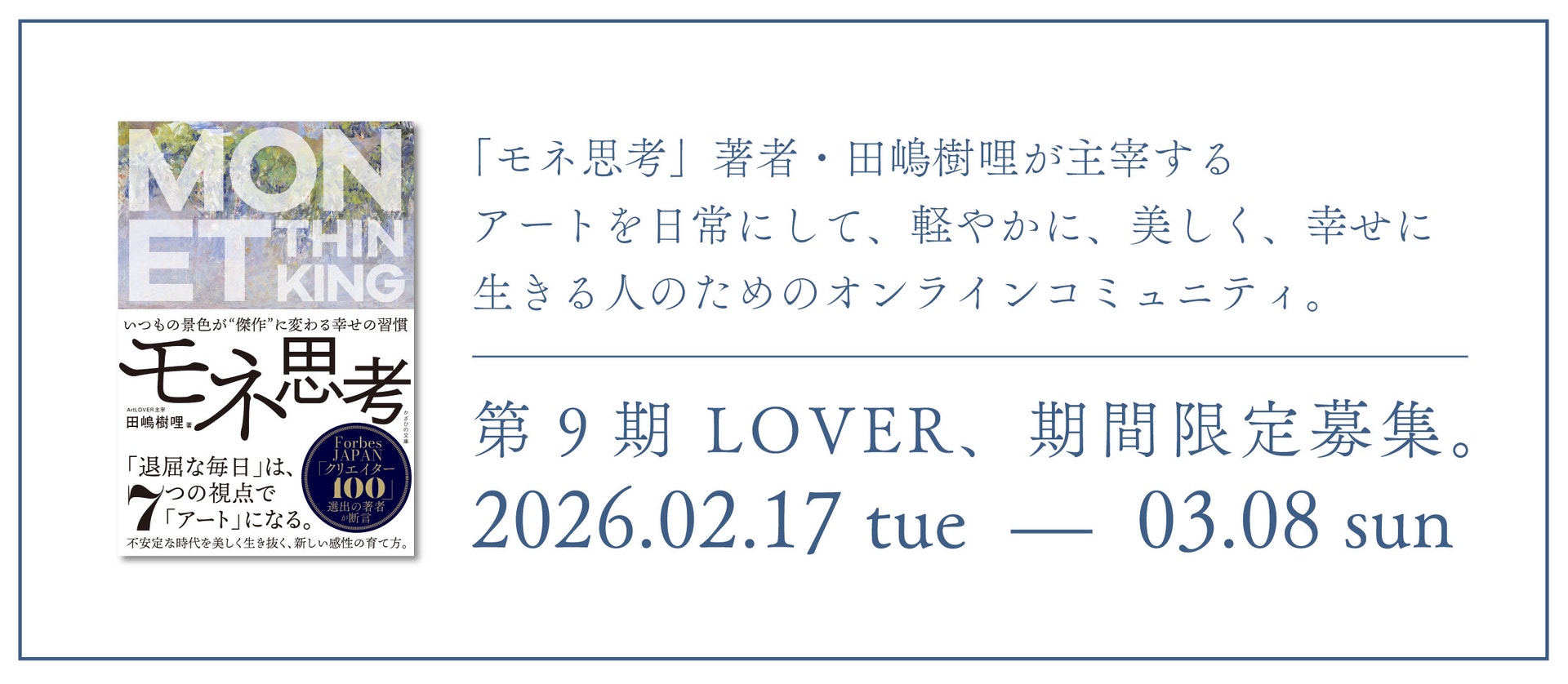近年では、モネの生涯と作品から得た洞察を凝縮した、初の著書『 モネ思考 - いつもの景色が “ 傑作 ” に変わる幸せの習慣 』(かざひの文庫)を、2025年9月26日に出版。